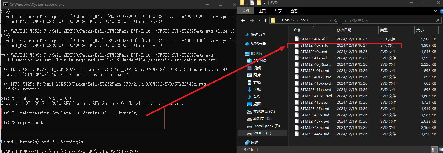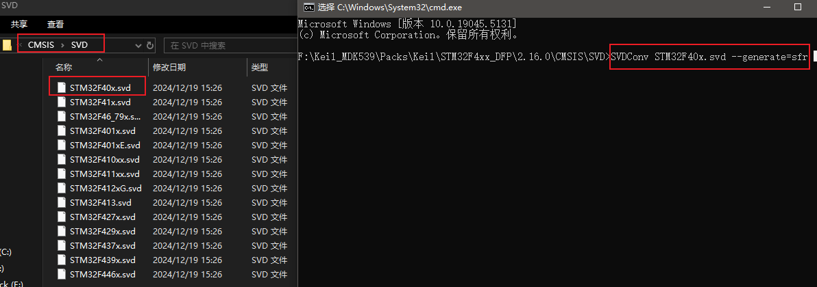 3)、接著,就可以通過cmd進入pack包目錄,執行SVDConv xxxx.svd --generate=sfr 如圖4所示,這里我們只轉換一個F40x的svd文件作為演示。