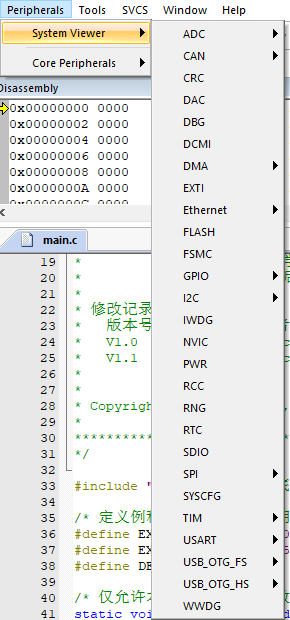 7)、導入后,我們來到調試界面,可以看到,外設寄存器全部出現了,如圖7所示。