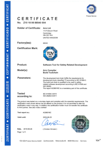Arm Compiler for Embedded FuSa是一個合格的C/C++工具鏈,已通過安全認證機構TüV SüD的評估。合格的工具鏈適用于為汽車、工業、醫療、鐵路和航空等安全市場開發嵌入式軟件。憑借TüV證書和全面的認證套件,用于嵌入式FuSa的Arm編譯器極大地簡化了整個“工具認證”過程,使最終用戶能夠專注于他們的最終產品開發。