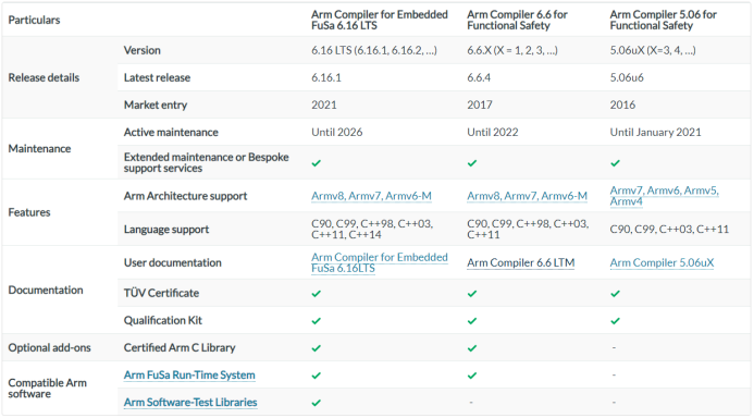 用于嵌入式FuSa 6.16LTS的Arm編譯器包括: