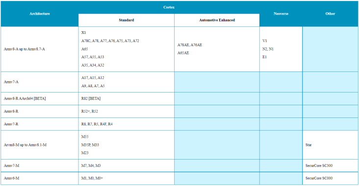 根據許可條款,Arm Compiler for Embedded FuSa 6.16LTS可用于構建以下 Arm架構和處理器: