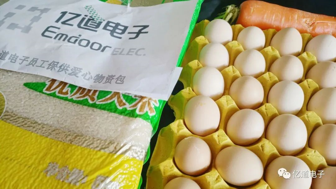 本次“暖心包”可謂愛(ài)意滿(mǎn)滿(mǎn),考慮到不同家庭不同的需求,公司特意準(zhǔn)備了一份營(yíng)養(yǎng)均衡的防疫套餐:有豬肉、大米、雞蛋、蔬菜、水果,拎在手上感受到的盡是“沉甸甸”的來(lái)自?xún)|道電子公司的關(guān)愛(ài)。