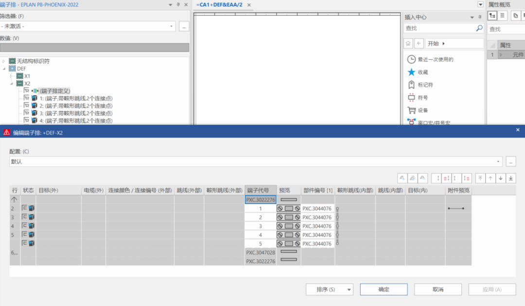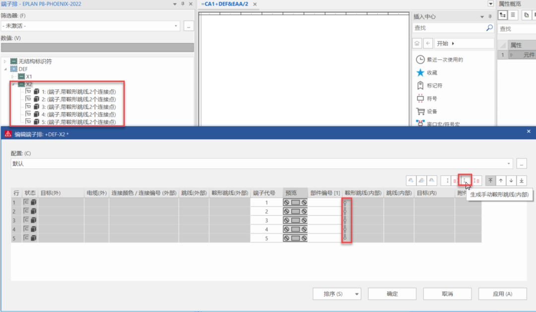 (1)打開EPLAN Electric P8 2022,在端子導航器中建立“-X2”端子排并建立5個空端子(沒有放置在原理圖上)。注意,沒有端子排定義,其中“-X1:1-5”為常規帶鞍形跳線端子。右鍵“編輯”“-X2”,生成鞍形跳線短接5個端子。