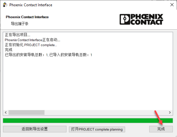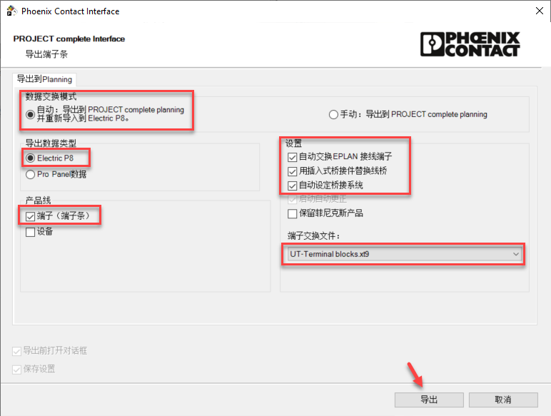 (3)彈出“Phoenix Contact Interface”,按圖中紅框所示進行勾選,選擇“自動:導出到 PROJECT complete planning并重新導入Electric P8”,點擊“導出”。