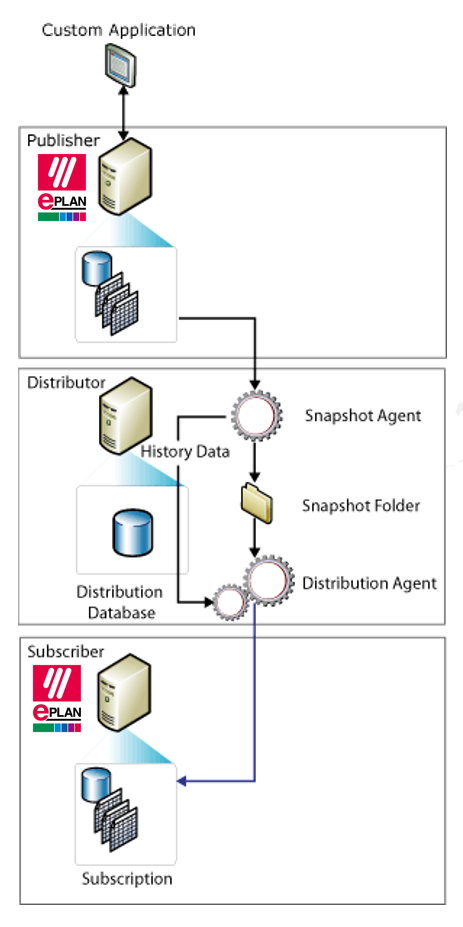 用戶的服務器可作為發布服務器(Publisher)對部件庫進行分發(Distributor),形成快照代理(Snapshot Agent)存儲于快照文件夾(Snapshot Folder)中。后由分發代理(Distribution Agent)分配給訂閱服務器(Subscriber),也就是EPLAN的客戶端電腦。