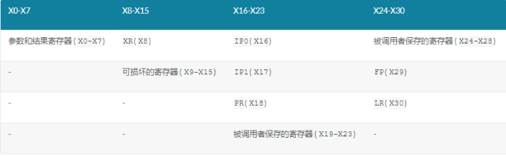 函數(shù)foo()可以使用的寄存器,且不需要保存的寄存器是X0-X15,但如果foo()要使用X19-X28必須先將其保存到堆棧中,然后在返回之前從堆棧中恢復(fù)。
