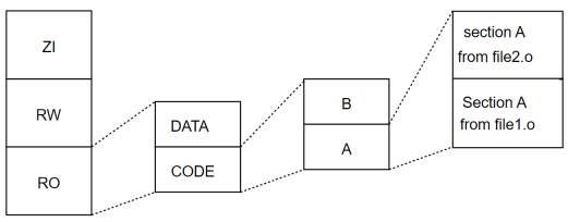 鏈接器將可執(zhí)行文件加載到地址0X8000,先放置只讀(RO)部分,然后是讀/寫(R/W)部分,然后是零初始化(ZI)部分。