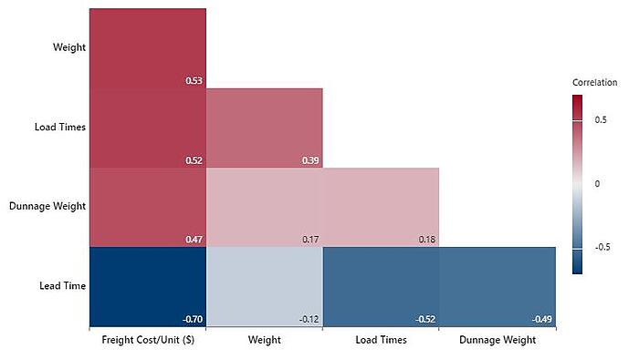 Minitab 的供應鏈模塊提供調查單位運費的工具。考慮用相關圖調查連續因素,如運費、裝貨時間、裝貨重量和墊料重量。