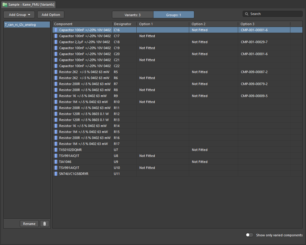 除了對設計中的特定元件進行常規變量管理外,您此時還可以從所選原理圖、所選圖紙符號的參考圖紙或所選元件類中創建元件組,并對元件變量進行基于功能的查看。對于每個組,您可以定義一個或多個‘選項’,以反映該組中一個或多個元件的一些更改。然后,可以根據這些定義組和選項,創建變量本身,并支持創建變量的層次結構。
