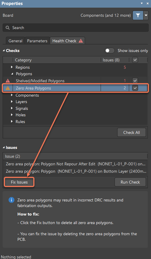 此時,您可以使用Properties面板上的Health Check標簽(在Board模式下訪問),檢測并刪除具有零面積的多邊形鋪銅。Zero Area Polygons新字段已添加到Polygons類,以確保您此時能夠使用Issues區域內的Fix Issues按鈕一次性刪除所有這些多邊形鋪銅。