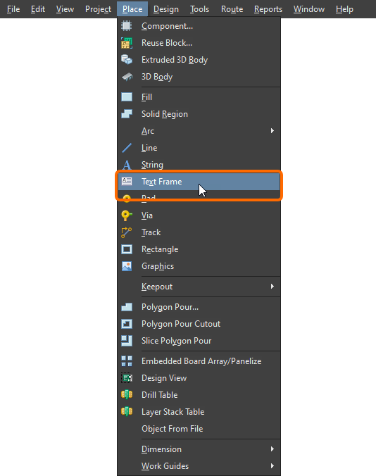為了支持前一版本中實施的在String和Frame模式下快速放置Text對象,除了現有String命令外,還在PCB和PCB封裝編輯器的主Place菜單和Active Bar中,增加了一個新的Text Frame命令。