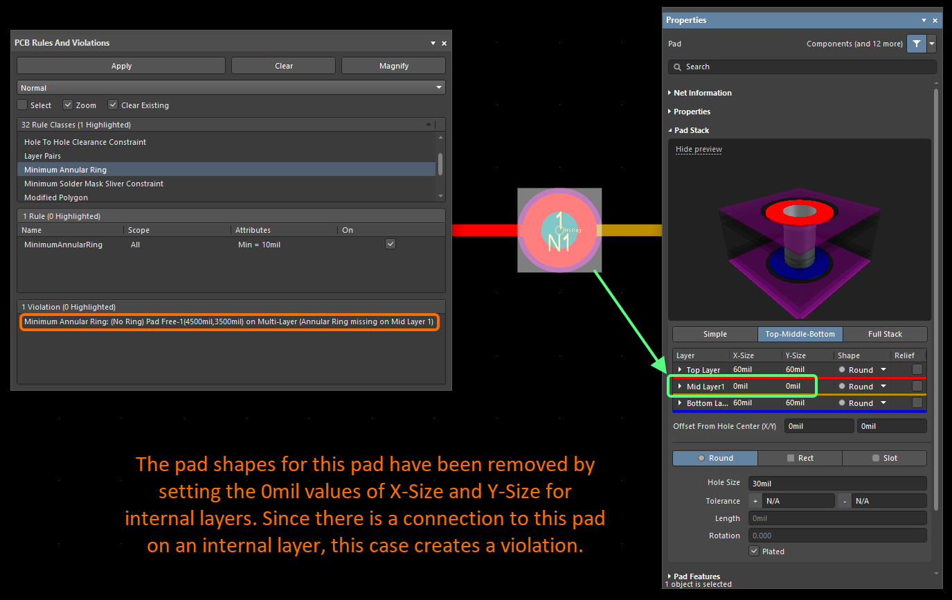 現在,對于連接到層上的焊盤/過孔形狀小于焊盤/過孔的孔尺寸的情況,可以檢測到Minimum Annular Ring設計規則違規(例如,已在Properties面板中手動配置或通過使用Remove Unused Pad Shapes工具移除過的焊盤/過孔形狀)。新功能示例如下圖所示。