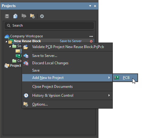 創建一個復用塊時,可向其添加多個PCB模型。為此,請通過Projects面板上復用塊條目處的右鍵單擊菜單,使用Add New to Project ? PCB命令。