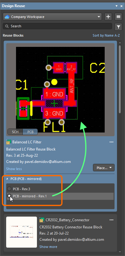 當將復用塊保存到Workspace時,其PCB模型將被列入Design Reuse面板上復用塊的PCB部分,并且可通過單擊復用塊標題中的Show more控件,進行顯示。在列表中選擇需要的PCB模型后,復用塊將采用被放入的模型。當選擇PCB進行預覽時,所選PCB模型將被顯示在復用塊標題的預覽區域。