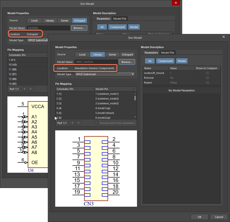 此時,已放置元件的源位置顯示在Location字段的Sim Model對話框中。您可以使用此功能,快速查看所用源是否位于期望位置。