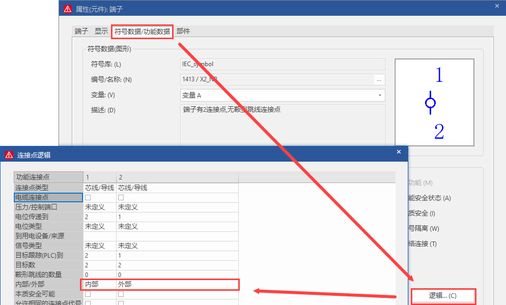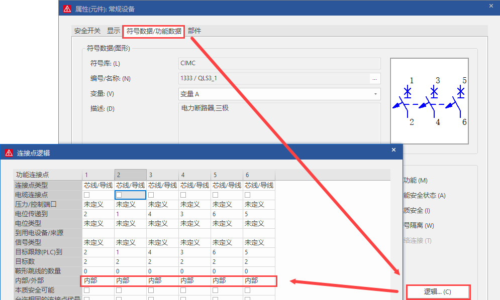 可在圖紙中雙擊符號,單擊符號數(shù)據(jù)/功能數(shù)據(jù)選項(xiàng)卡中的邏輯按鈕來查看連接點(diǎn)的內(nèi)部/外部信息。例如下圖所示的安全開關(guān)符號的6個(gè)連接點(diǎn)都為內(nèi)部。