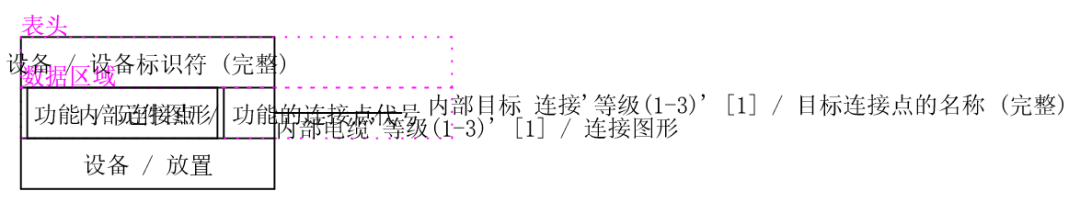 設(shè)備連接圖的數(shù)據(jù)結(jié)構(gòu)組成主要可由三部分構(gòu)成,與常規(guī)的其他動(dòng)態(tài)表格類似,分別是表頭、數(shù)據(jù)區(qū)域和數(shù)據(jù)間分隔符。設(shè)備連接圖的內(nèi)容構(gòu)成主要由兩部分構(gòu)成,分別是圖形和占位符文本。