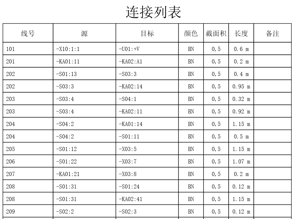 除了可以為配線人員提供電氣原理圖之外,其他比較常見的方式還有接線表和接線圖。接線表是以導(dǎo)線為對象,展示每根導(dǎo)線的信息,例如,線號、源、目標(biāo)、線徑、顏色等。