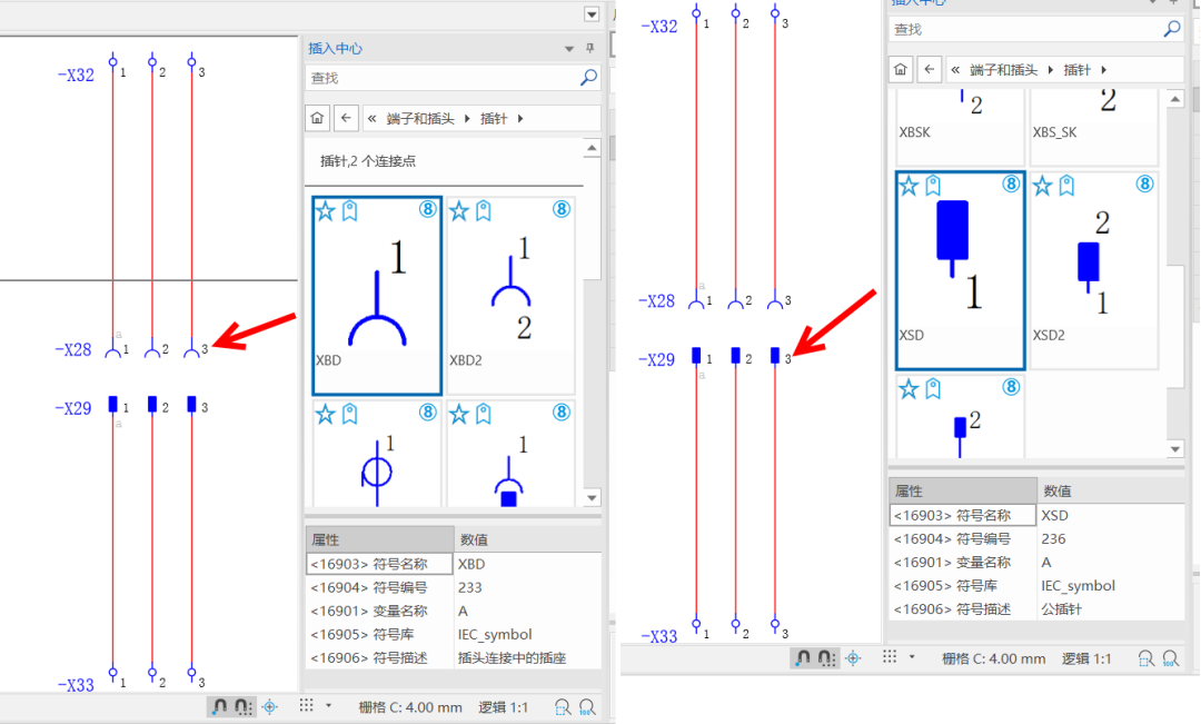 01在Electric P8中設(shè)計線束原理圖時,經(jīng)常會使用連接器,但在使用連接器插針符號時,需要根據(jù)實際應(yīng)用場景選擇合適的插針符號,當(dāng)連接器沒有與對插的公或母頭,可以使用符號【XBD】或【XSD】,如下圖。