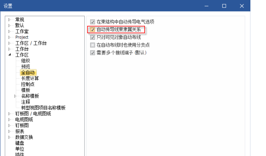 在束結(jié)構(gòu)中自動(dòng)傳導(dǎo)電氣選項(xiàng):在為對(duì)象指定電氣選項(xiàng)時(shí),此選項(xiàng)還將應(yīng)用于連接到對(duì)象的所有元素 (如果已激活)。