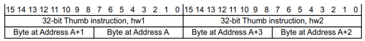 Thumb指令要求強制16位對齊,那么32位指令就會分成兩個半字hw1,hw2。其中hw1位于較低地址。在下圖所示中hw1位于hw2的左側。