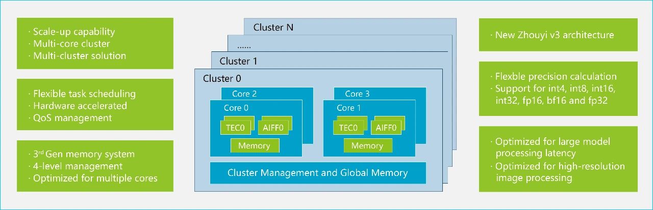 “周易”X2 NPU作為新一代人工智能處理器,采用第三代“周易”架構,支持多核Cluster,最高可達320TOPS子系統。實時的硬件任務管理使得“周易”X2 NPU可實現最高千萬次/秒的任務調度,將各個計算單元的效能發揮到最佳。在算力大幅提升的同時,“周易”X2 NPU還具有更高的精度和靈活性。在精度方面,“周易”X2 NPU支持int4 / int8 / int12 / int16 / int32,fp16 / bf16 / fp32多精度融合計算,計算效率與計算密度得到顯著提升。在靈活性方面,“周易”X2 NPU在支持自定義算子、滿足各種模型部署需求的基礎上,還面向各類應用場景提供定制化AI解決方案,以進一步滿足客戶在智能駕駛、手機影像AI處理、人機交互等場景中的差異化需求。