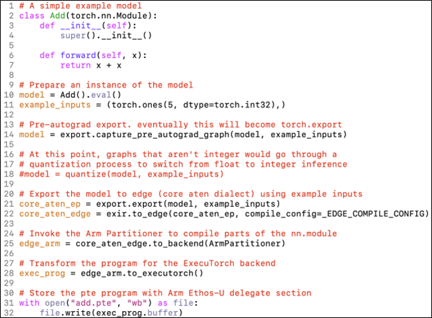 它可以簡單到只需在 python 中的現有 PyTorch 模型中添加少量行,就能以 .pte 文件的形式捕獲模型的完整表示。