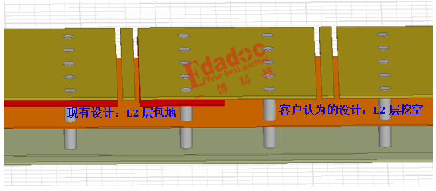 因此我們根據PCB設計建立了這么一組對比的3D模型,看看L2層按照現有的設計和把L2層地都挖空掉,也就是按照客戶所提供的阻抗計算模型的那樣子,模型就是下面這樣了。