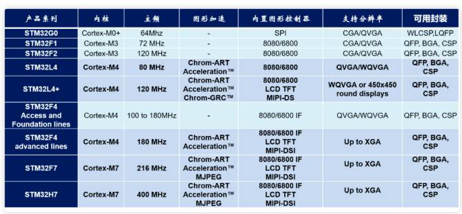 STM32的圖形產品線非常豐富,擁有190多個型號,涵蓋不同的顯示接口和封裝。內核方面更是從M0+到M7一應俱全。
