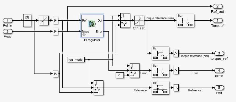 由實(shí)際轉(zhuǎn)速和給定轉(zhuǎn)速作為輸入量,通過PI控制器得到轉(zhuǎn)矩給定,作為輸出量,送至FOC模塊。其中MagC是一個(gè)二進(jìn)制信號,表示機(jī)器是否足夠磁化以啟動(1)或不(0)。該信號通常由磁場定向控制器FOC提供。