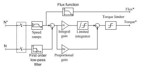 實(shí)現(xiàn)電機(jī)對給定轉(zhuǎn)速的追蹤,并作為控制外環(huán),將輸出作為轉(zhuǎn)矩的給定信號送入轉(zhuǎn)子磁鏈定向控制模塊。雙擊此模塊,具體結(jié)構(gòu)如下: