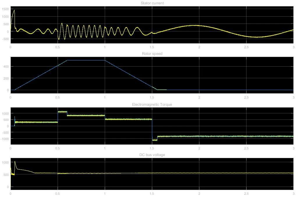 (6)、?1.5-1.55s:此時(shí)負(fù)載轉(zhuǎn)矩變?yōu)樨?fù)值,電機(jī)變?yōu)榘l(fā)電機(jī)運(yùn)行,此時(shí)轉(zhuǎn)速不為零,為了跟隨給定轉(zhuǎn)速,電磁轉(zhuǎn)矩要比負(fù)載轉(zhuǎn)矩要小,這樣才能繼續(xù)實(shí)現(xiàn)減速,從而跟隨給定,至1.55s時(shí)轉(zhuǎn)速變?yōu)榱恪?/span>