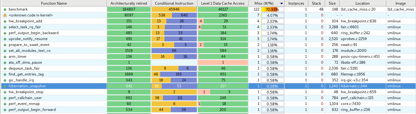 事件包顯示了每個函數中符合條件和不符合條件的采樣比例,以及每個線程和進程中事件的加總數。通過點擊第一列的表,可以將這些比例單獨成列用來排序,這些獨立的列顯示了符合條件的事件量,以及占總量的比例。通過對這些列的排序,可以確定哪些函數導致緩存存取失敗,或哪些函數導致分支預測失敗率高。