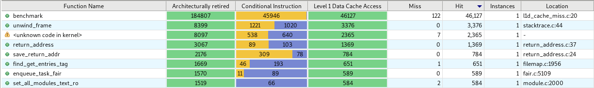 比如Architecturally retired圖顯示了采樣的指令后完成了和沒有完成的數量,總量顯示了冒險執行的總指令量。類似地, Level 1 Data Cache Access圖顯示了采樣指令中含有對L1數據緩存存取指令總數,以及hit/miss比例。