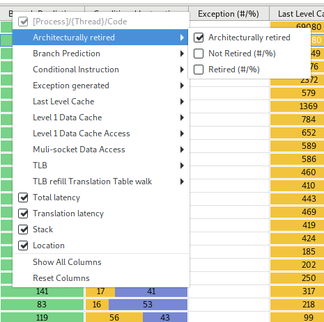 下圖顯示添加了更多SPE計數器的時間圖。SPE事件包內的多種屬性顯示再堆疊圖上。這些圖顯示了某種屬性在樣本中存在和不存在的比例。白色方塊中顯示再所選事件內包含某種屬性樣本的總和。有些屬性和某些特定類型的指令相關,比如分支,存取。