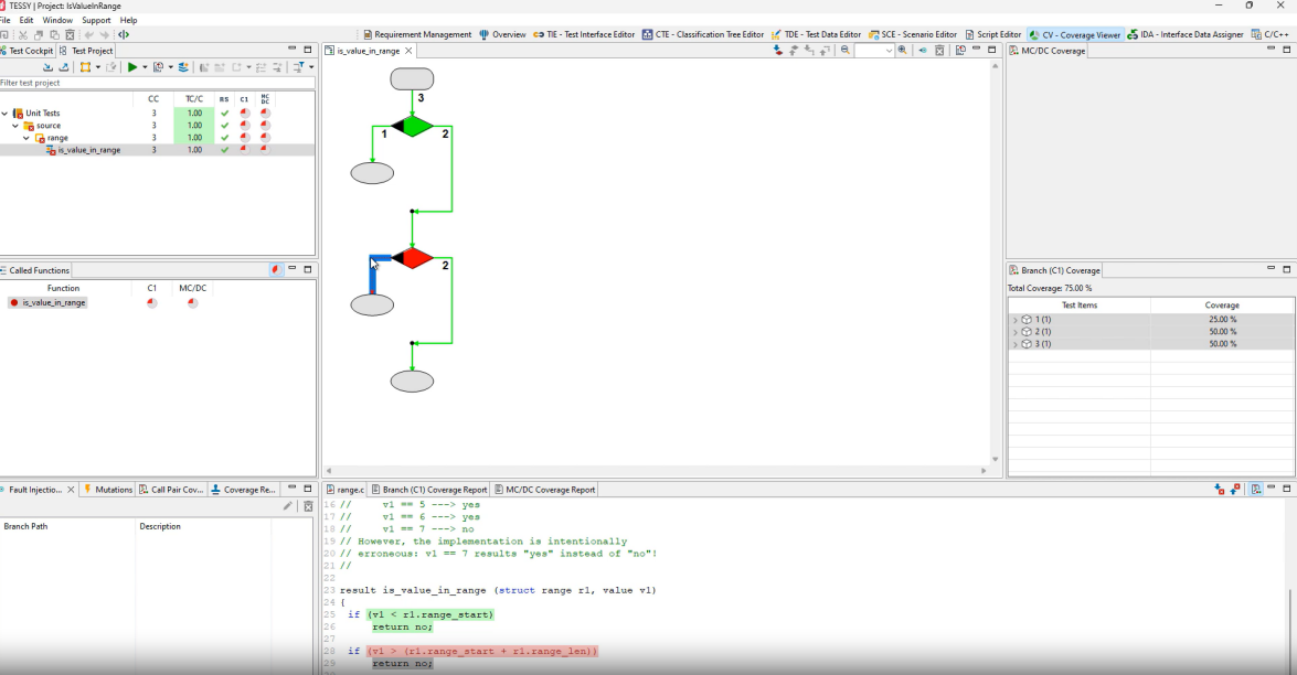 支持分支覆蓋(C1)、MC/DC(修正條件/判定覆蓋)、MCC(多條件覆蓋)等高階覆蓋率標準,滿足安全關鍵系統要求。