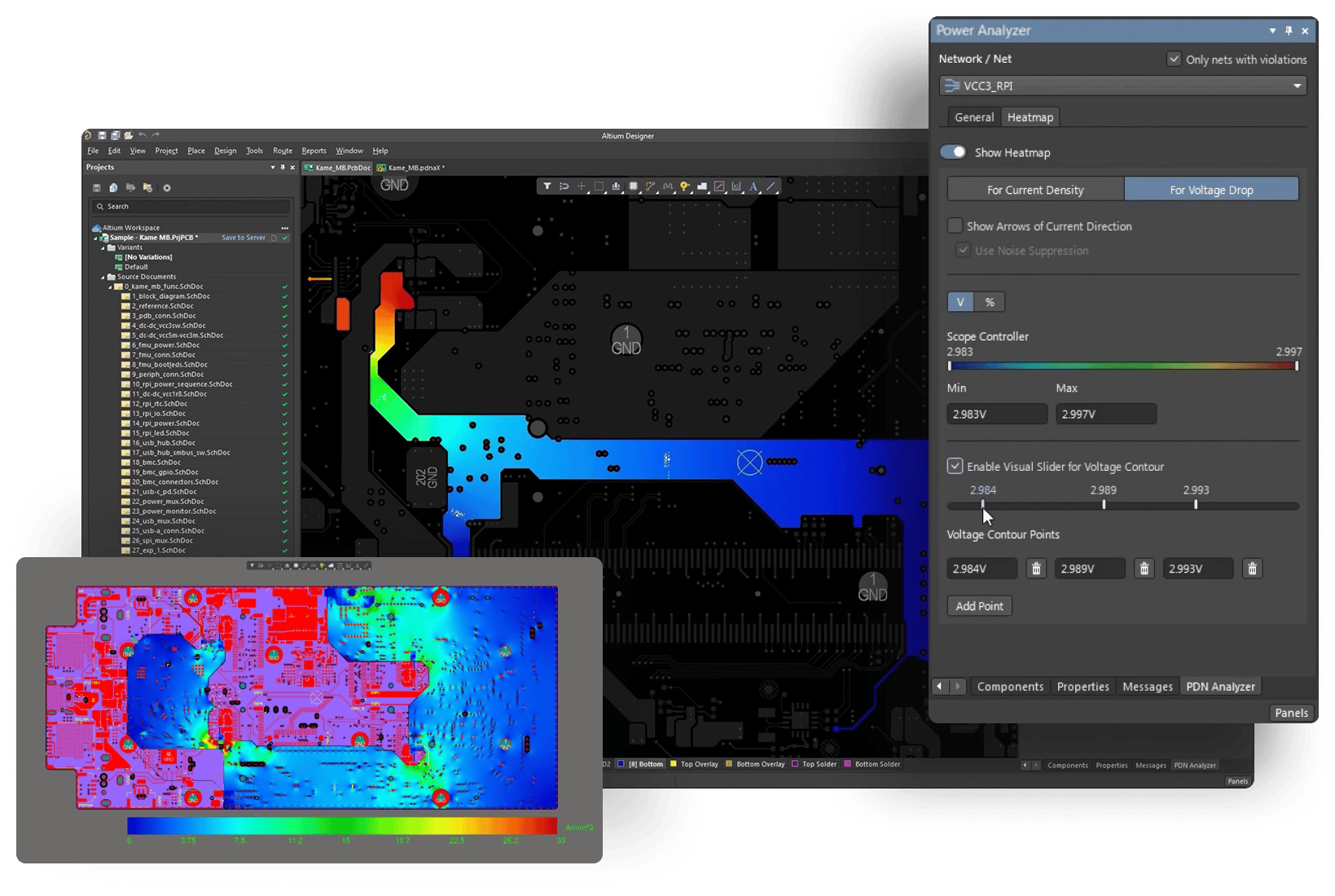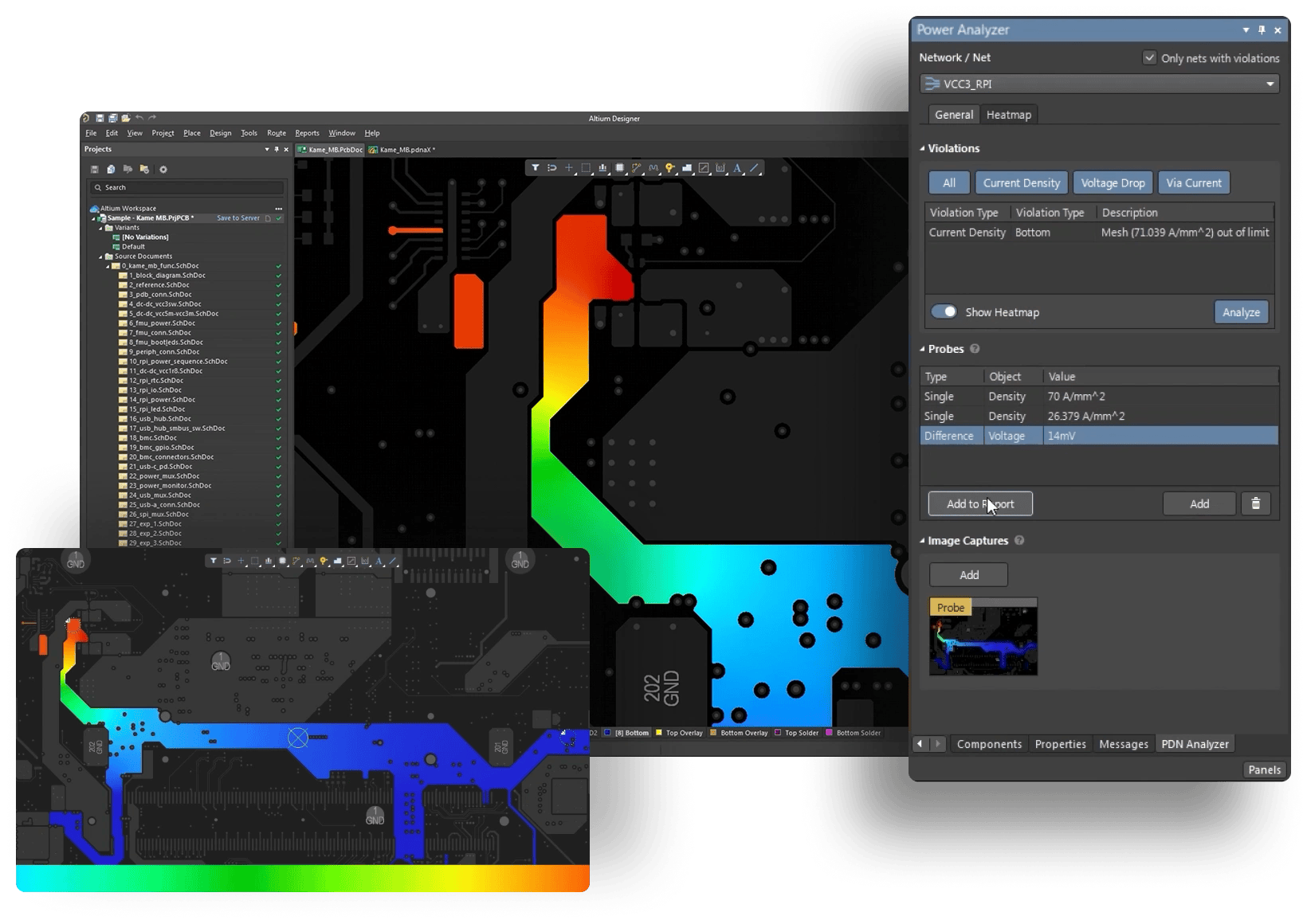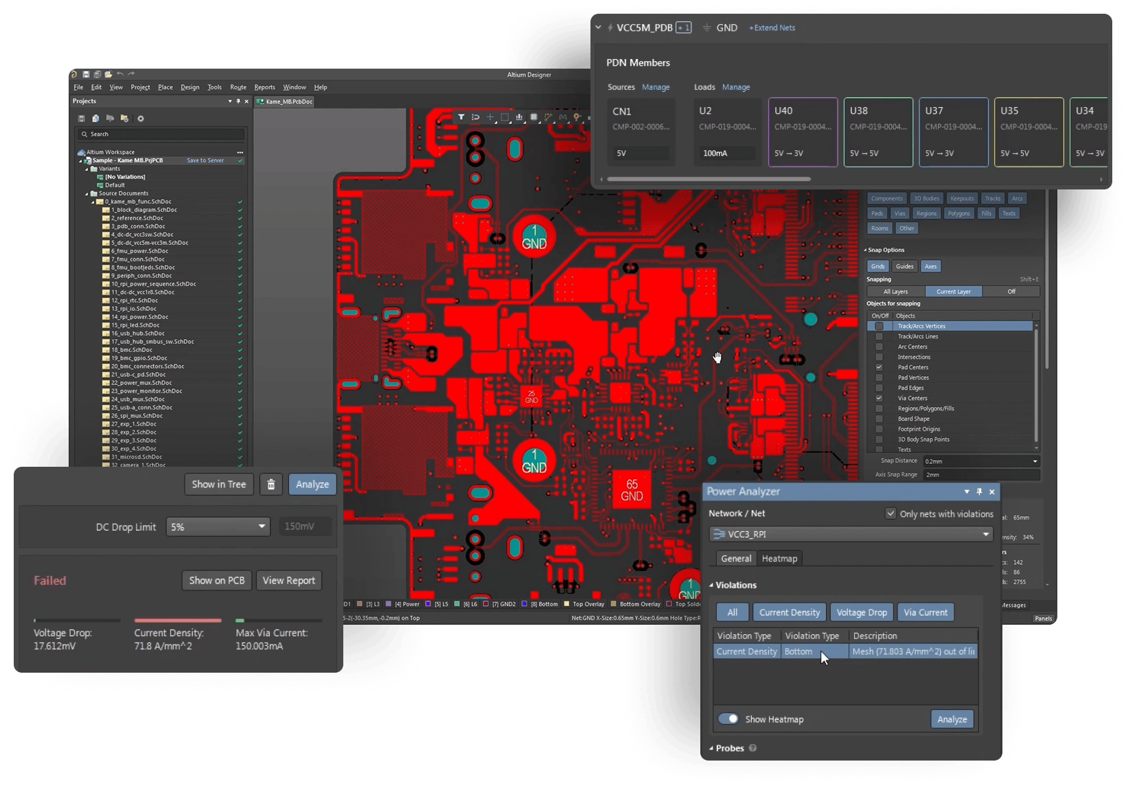 Power Analyzer 為您提供了一種簡單、直觀的方法來可視化電壓和電流密度分布、電流方向和熱點。結果直接顯示在Altium Designer布局編輯器中,讓您了解電源網絡如何與設計的其余部分交互。
