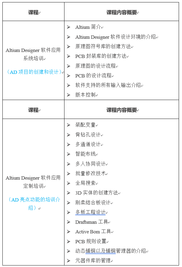 Altium Designer軟件培訓(xùn)課程分系統(tǒng)培訓(xùn)課程和定制培訓(xùn)課程,收費(fèi)標(biāo)準(zhǔn)如下: