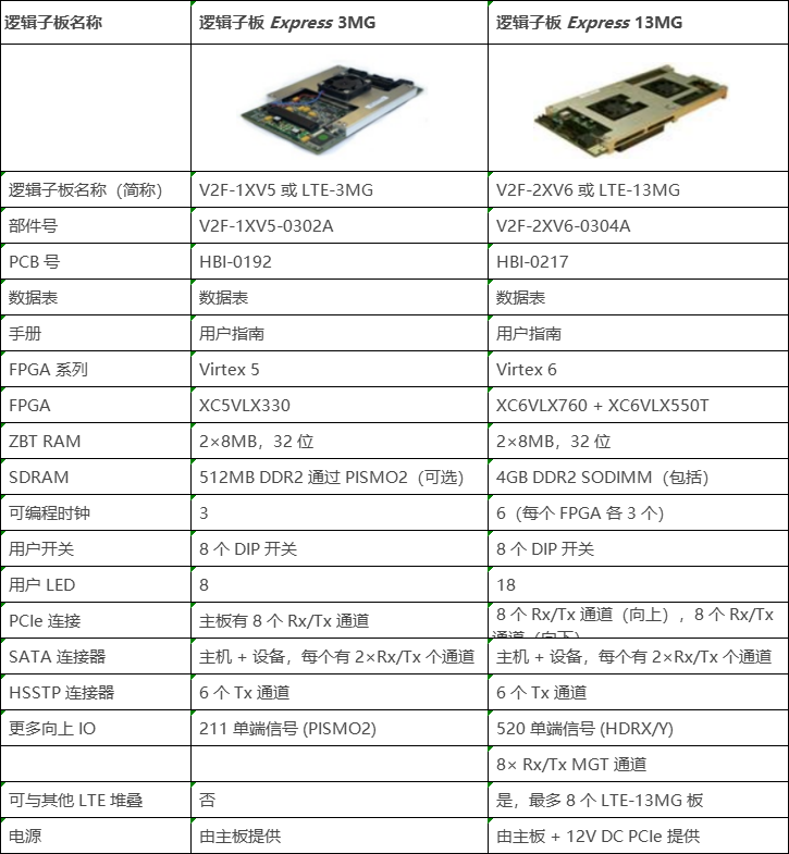 有兩種可用的邏輯子板 Express 板。兩者均基于 Xilinx FPGA: