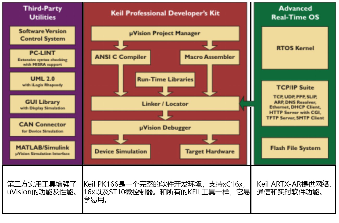 產業標準的Keil C編譯器、宏匯編器、調試器、實時內核、單板計算機和仿真器,支持大部分的C16x系列微控制器,幫助你如期完成項目進度。