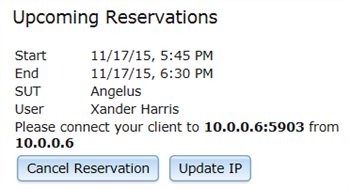 相反,進入SUT或測試設備的IP地址和TCP / IP端口,輸入的IP地址Eggplant自動化的云服務器,并分配一個端口Eggplant Automation Cloud。例如,使用下面顯示的Eggplant Automation Cloud預留,測試人員會告訴 Selenium 或 Appium 在 IP 地址 10.0.0.6,端口 5903 上進行連接。