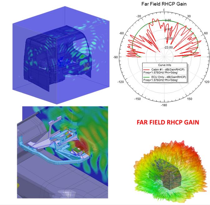 · 車載多射頻系統(tǒng)RFI分析 以車載多射頻系統(tǒng)為研究對象,使用軟件ANSYS HFSS,分析了多個(gè)射頻通信系統(tǒng)共址且同時(shí)運(yùn)行的復(fù)雜情景,并且包含定位干擾問題所需的所有全系統(tǒng)級的相互作用,用于干擾優(yōu)化方案的評估。