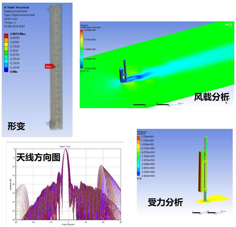 · 基站天線系統(tǒng)多物理場仿真 以基站天線為研究對象,使用軟件ANSYS HFSS,將經(jīng)過優(yōu)化的天線模型導(dǎo)入workbench平臺(tái),利用CFX分析天線周圍風(fēng)速、風(fēng)洞內(nèi)氣流行為、湍流檢測等,將風(fēng)壓導(dǎo)入Mechanical計(jì)算基站天線是否發(fā)生形變,從而獲得基站天線全方位的性能分析。