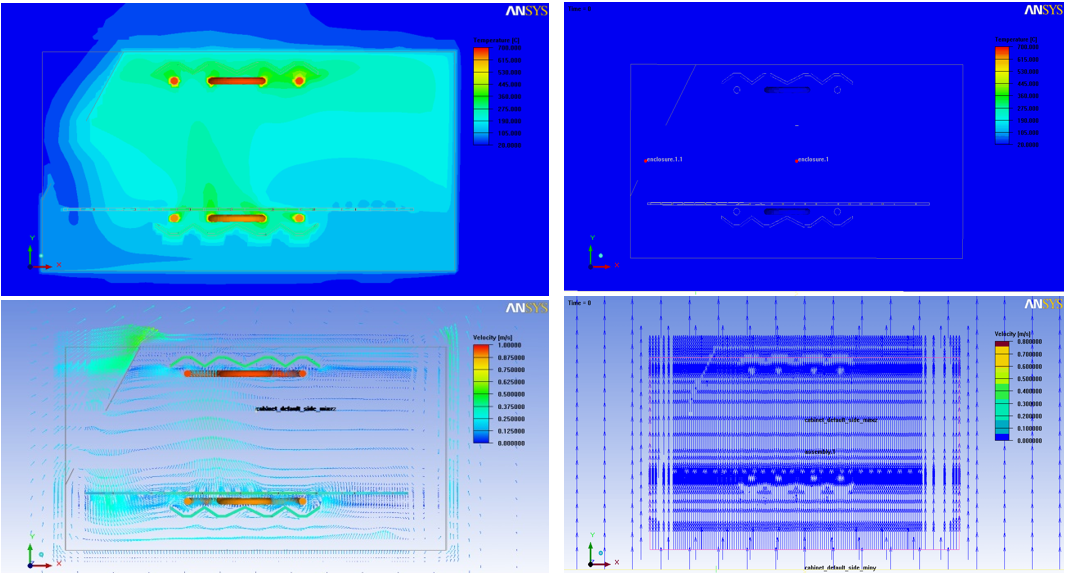 · 烤箱均勻性仿真計算 以烤箱為研究對象,通過ANSYS ICEPAK對烤箱內部的溫度場進行仿真,考慮熱傳導、熱對流和熱輻射的綜合影響,得到整個烤箱內部的溫度場及速度場分布。指出添加折流板以增加熱輻射效果,保證烤箱內部的溫度均勻性。