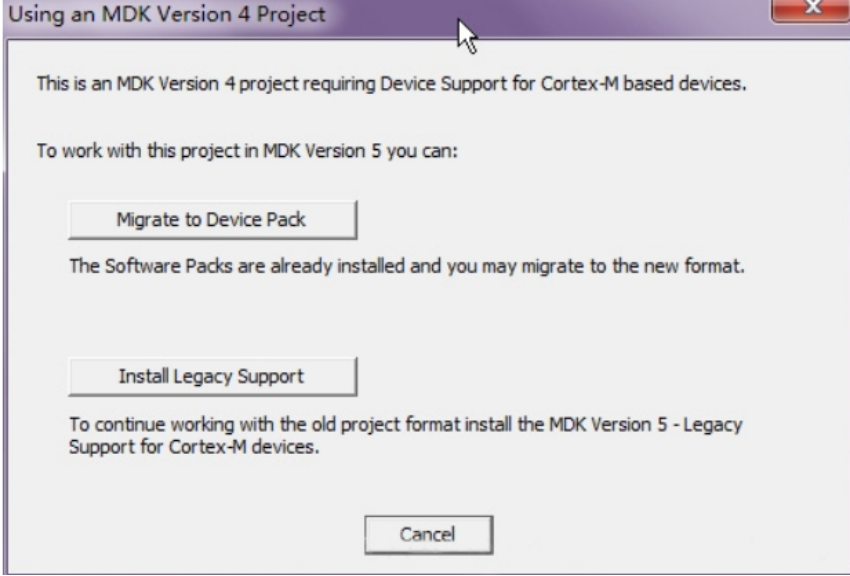 在用MDK5打開MDK4版本的項(xiàng)目工程的時(shí)候,通常會(huì)跳出一個(gè)窗口Using an MDK?Version 4 Project: