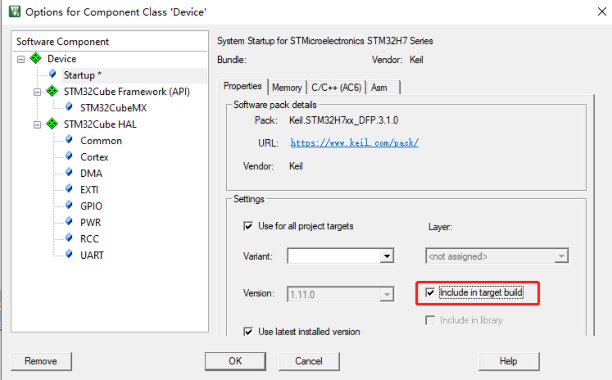 3? 再次?單擊 選中“startup_stm32h743xx.s”文件,按“Alt+F7”,在彈出的圖 4 對話框中勾選“Include in Target build",并點擊"OK"。