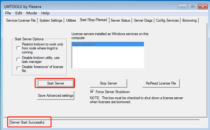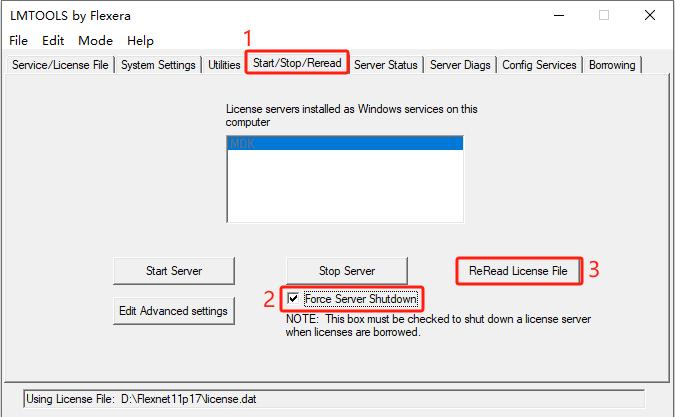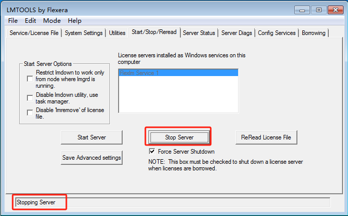 3? 打開LMTOOLS選擇 Start/Stop/Reread 標簽,勾選“Force Server Shutdown”復選框,然后單擊“Reread License file”按鈕以讀取armlmd.opt文件中的新選項。