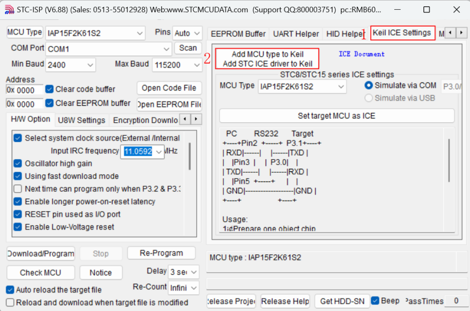 2)、運行“stc-isp-15xx-v6.88”,選技“Keil ICE Settings-->Add MCU type to Keil ...”,如圖4-1所示: