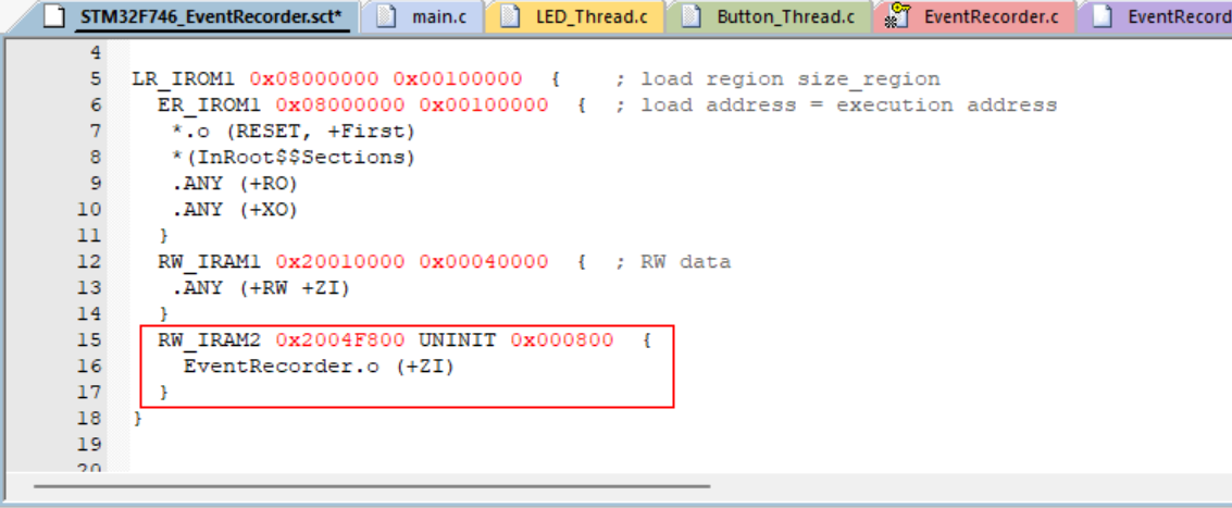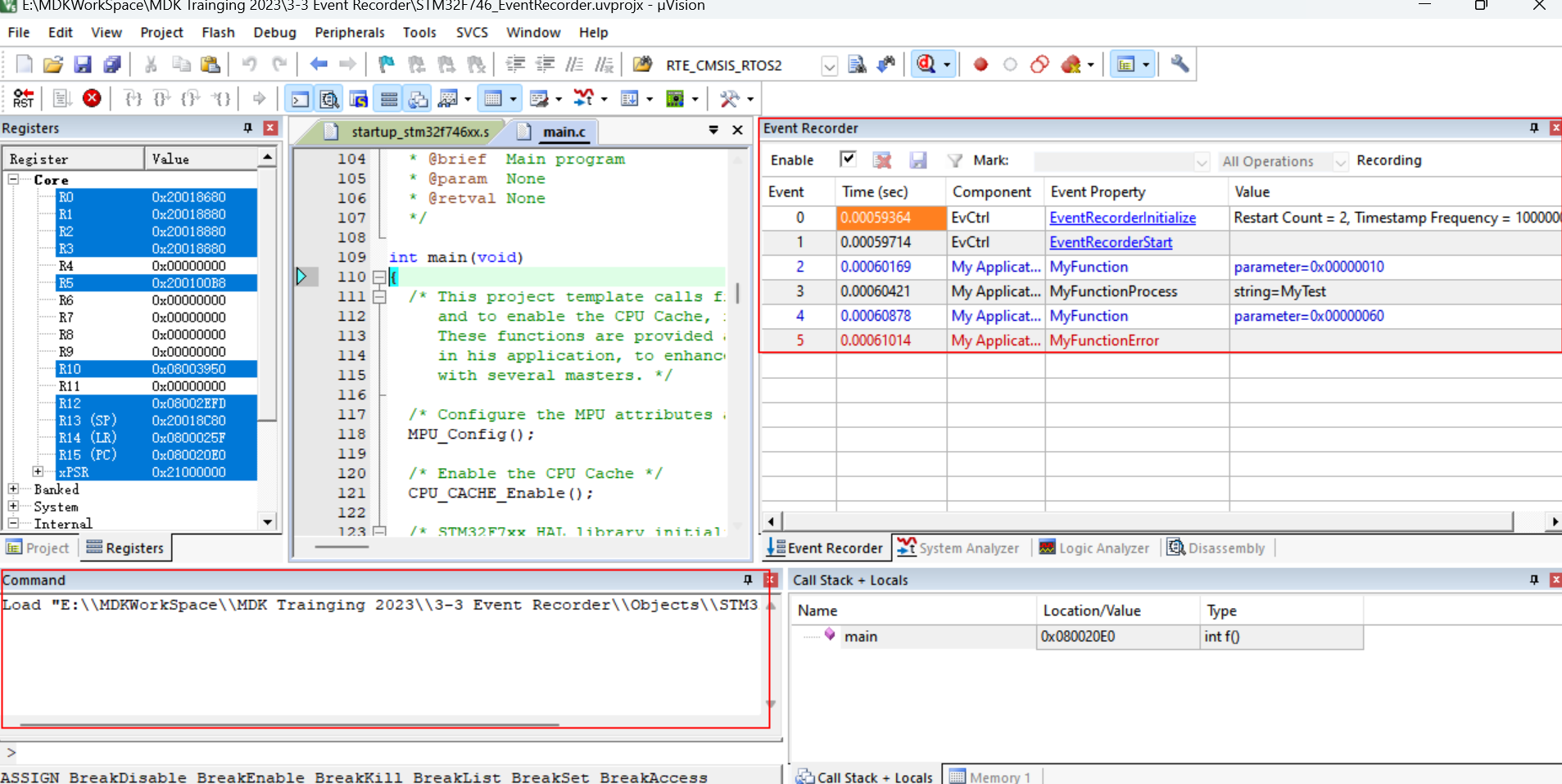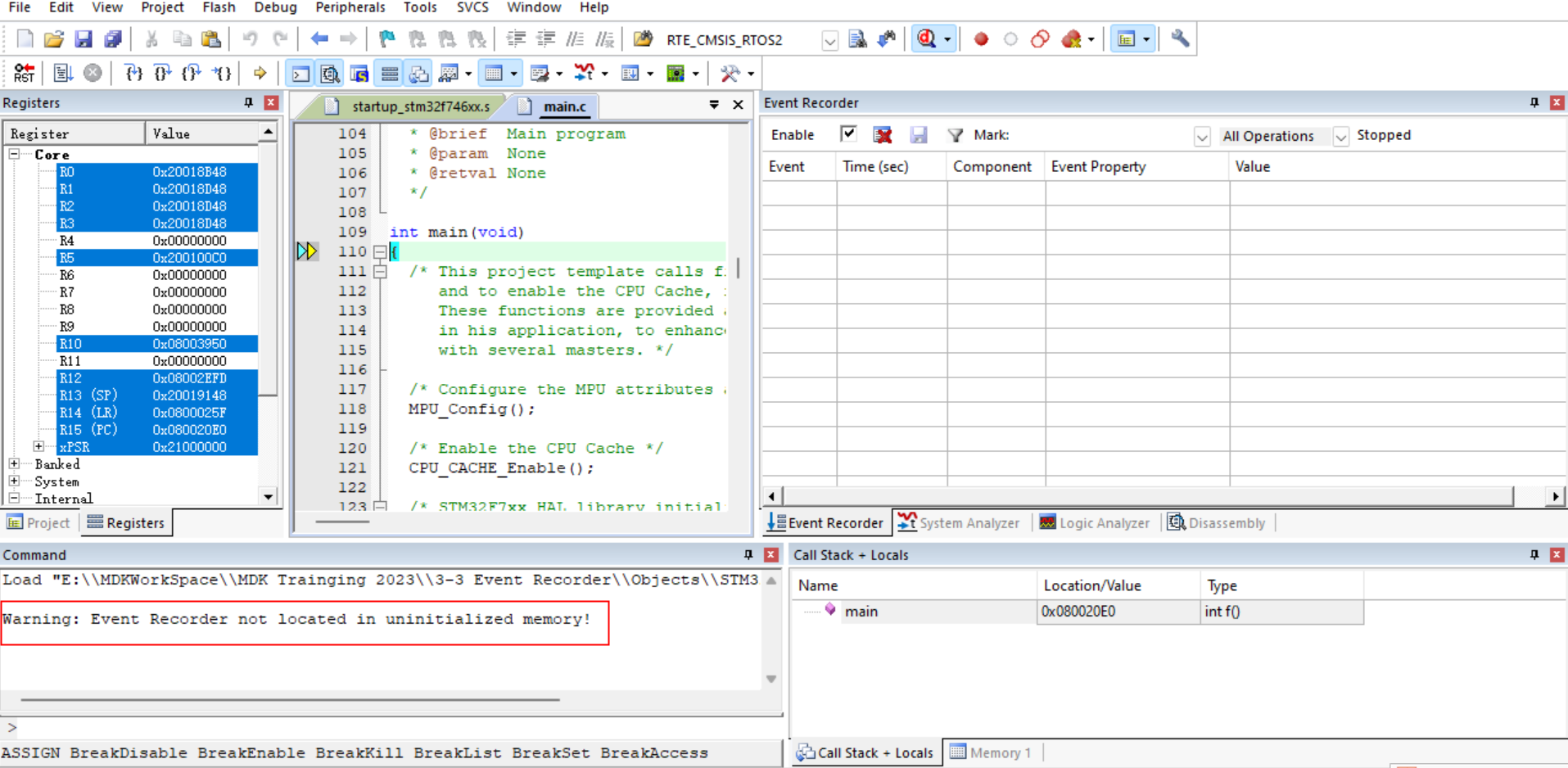 4)重新編工程,再進入調試模式,則已沒有“Warning: Event Recorder not located in uninitialized memory!”警告信息,如圖4-4所示: