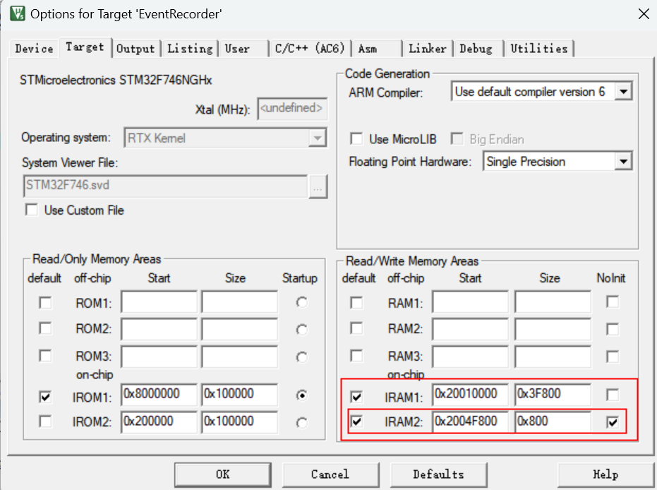 1)打開工程的build option窗口,在“Target”菜單,在內存中指定0x800空間為未被初始化,如圖4-1所示: